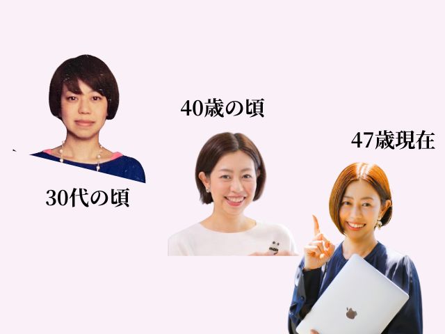 • 30代の私(写真左):母からの「家庭にいることが良い母の条件」という圧を感じ、本音に蓋をしていた時期です。辛いわけではありませんでしたが、「自分の思うようにやりたい!」という情熱を抑え込んでいたため、表情にはどこか「自由ではない硬さ」が滲んでいます。